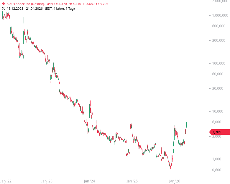 - Sidus Space Inc – WKN: A3E2FU – ISIN: US8261652015 – Kurs: 3,705 $ (Nasdaq)