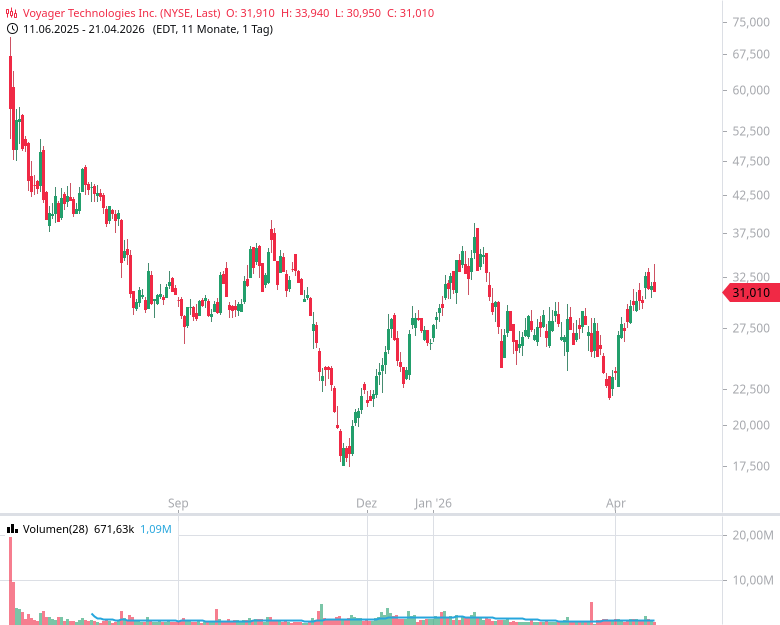 - Voyager Technologies Inc. – WKN: A41ADA – ISIN: US92892B1035 – Kurs: 31,010 $ (NYSE)