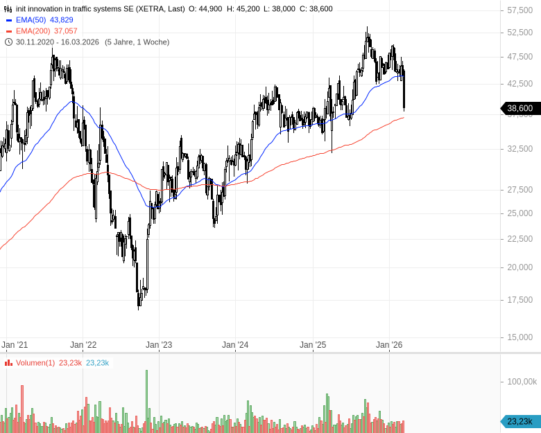 • init innovation in traffic systems SE – WKN: 575980 – ISIN: DE0005759807 – Kurs: 39,600 € (XETRA)