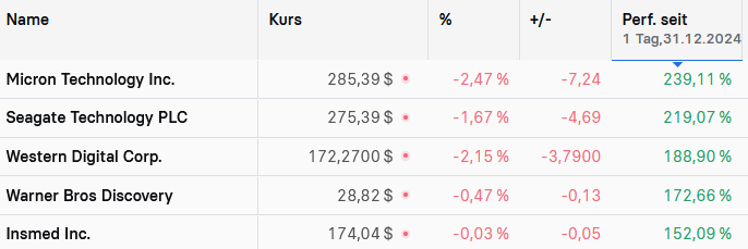 Schaut man auf den Nasdaq 100, fällt es leicht, zu identifizieren, was das Thema 2025 war. KI, klar, aber vor allen Dingen auch Speicher. Micron ließ mit einem Plus von 239 % andere Speicherpowerhäuser wie Seagate und Western Digital hinter sich. Micron ist einer von nur drei Playern im wichtigen HBM-Markt: eine Speichertechnologie, die vorrangig bei KI-Beschleunigern verwendet wird. Die gesamte Peergroup (SK Hynix, Samsung Electronics, Micron) hat sich im vergangenen Jahr exzellent entwickelt. Dazu kam im zweiten Halbjahr eine regelrechte Preisexplosion bei DRAM-Speicher. Privatanleger, die sich einen neuen PC anschaffen woll(t)en, werden ein Lied davon singen können.
