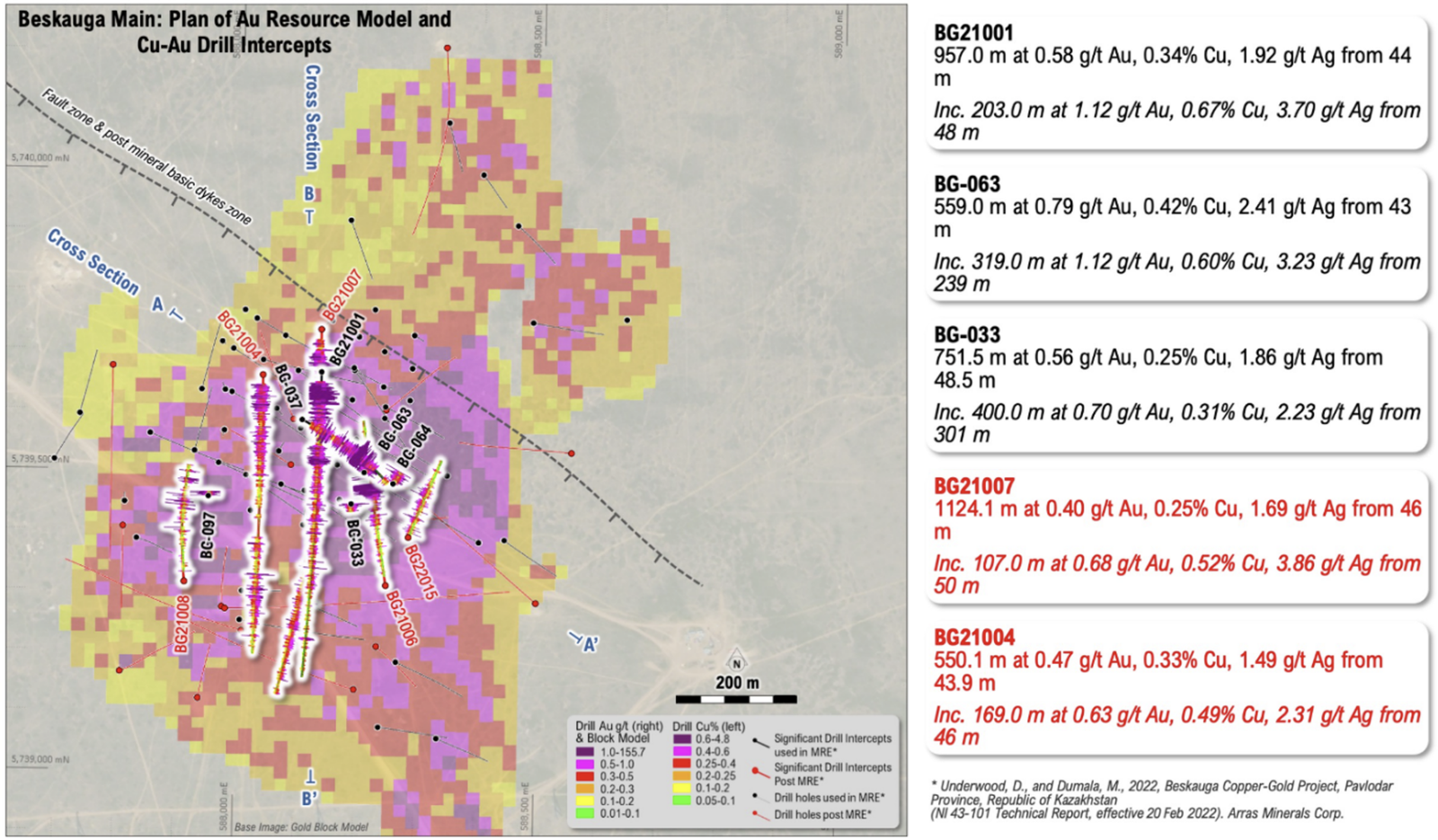 Hochinteressant bleibt Beskauga dennoch, weil die historischen Bohrabschnitte die Dimension des Systems illustrieren. In der Pressemeldung nennt Mogotes unter anderem 957,0 m mit 0,58 g/t Gold, 0,34 % Kupfer und 1,92 g/t Silber ab 44 m in Bohrloch BG21001, darin enthalten sind 203,0 m mit 1,12 g/t Gold, 0,67 % Kupfer und 3,70 g/t Silber ab 48 m. Weitere genannte Beispiele sind 751,5 m mit 0,56 g/t Gold, 0,25 % Kupfer und 1,86 g/t Silber ab 48,5 m sowie 616,2 m mit 0,46 g/t Gold, 0,23 % Kupfer und 1,14 g/t Silber ab 47,7 m.