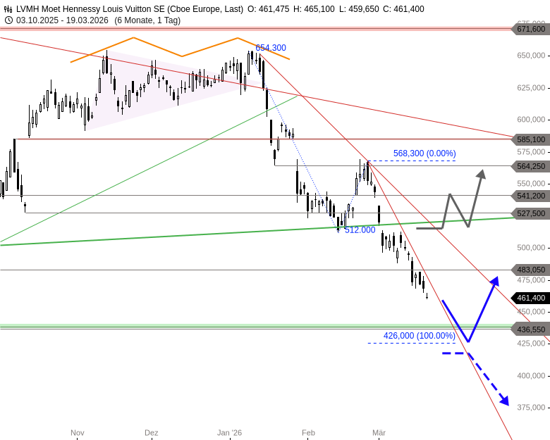 Der Versuch der Anleger, bei der Aktie von LVMH den übergeordneten, seit 2023 dominierenden Abwärtstrend zu verlassen, endete mit einem Doppeltop bei 654 EUR. Nach der Vollendung dieses bärischen Trendwendemusters und dem gescheiterten Ausbruchsversuch über die übergeordnete Abwärtstrendlinie fällt der Kurs seit Januar dynamisch ab.