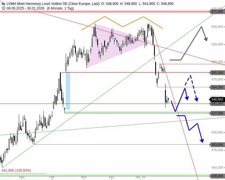 Charttechnisches Fazit: Die steile Verkaufswelle der letzten Tage könnte temporär enden und in eine leichte Erholung bis 564,25 EUR sowie darüber bis 585,10 EUR übergehen. Von einem Ende des Abverkaufs bei den Anteilen von LVMH kann jedoch noch nicht gesprochen werden.