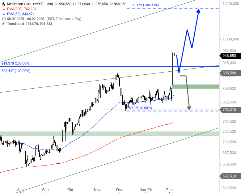 McKesson könnte in den nächsten Tagen leicht konsolidieren. Ein Rücksetzer auf das alte Allzeithoch bei 895,58 USD wäre nicht ungewöhnlich. Anschließend könnte die Aktie aber in Richtung 1.109,18 USD klettern.
