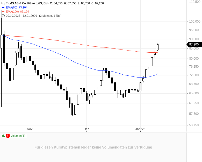 - TKMS AG & Co. KGaA – WKN: TKMS00 – ISIN: DE000TKMS001 – Kurs: 87,350 € (XETRA)