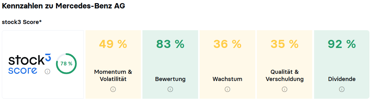 Fazit: Vor den bevorstehenden Quartalszahlen hoffen Mercedes-Aktionäre auf eine Bodenbildung in der Aktie. AUs charttechnischer Perspektive wirkt die Aktie im Bereich von 50 EUR gut unterstützt. Im stock3 Score schneidet die Mercedes-Aktie überdurchschnittlich gut ab und kann vor allem mit einer günstigen fundamentalen Bewertung mit einem KGV von ungefähr 9 auf Basis der Schätzungen für das laufende Jahr und einer Dividendenrendite von über 6 % auf Basis der Schätzungen für die kommenden Jahre punkten.