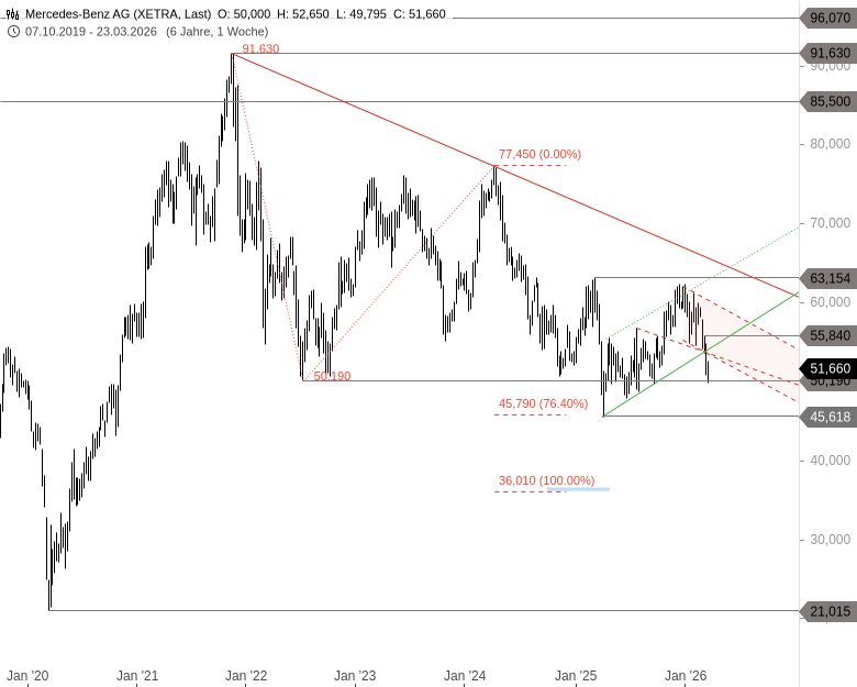 Seit nunmehr vier Jahren befindet sich die Aktie von Mercedes-Benz in einer Korrektur des steilen Anstiegs, der im Jahr 2020 von einem Tief bei 21,01 EUR bis Ende 2021 auf 91,63 EUR geführt hatte. Am unteren Ende dieser Korrekturphase konnte das Fibonacci-Projektionsziel bei 45,79 EUR im April letzten Jahres für den Start einer Erholung genutzt werden.