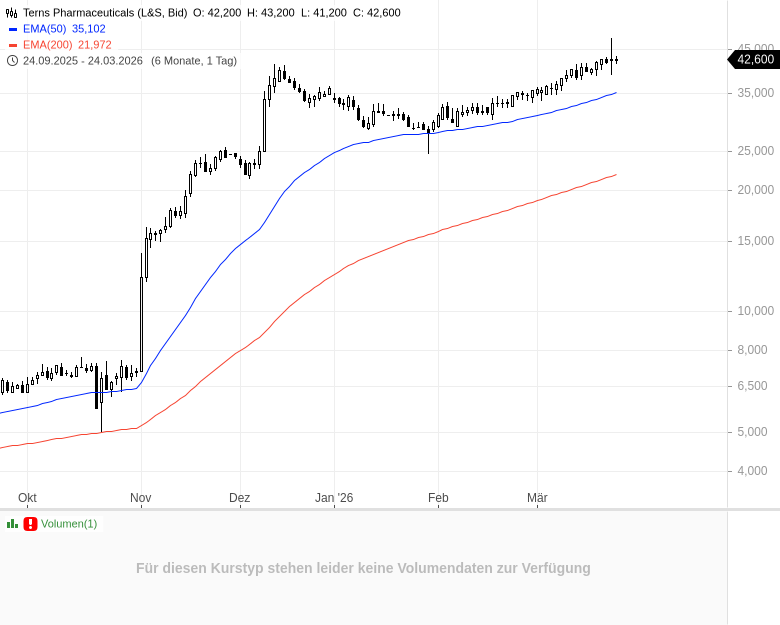 Im Raum steht ein Kaufpreis von rund 6 Mrd. USD. Die Börse bewertet Terns aktuell mit etwa 4,4 Mrd. USD, inklusive Schulden liegt der Unternehmenswert bei rund 5,1 Mrd. USD. Die Aktie hat seit ihrem Jahrestief Mitte Januar um etwa 50 % zugelegt. Merck bringt derzeit rund 288 Mrd. USD auf die Börsenwaage.