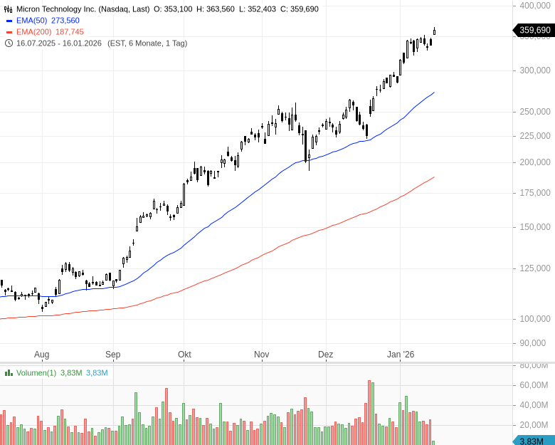 Gegenüber einem im April 2025 erreichten Tief hat sich die Aktie von Micron Technology inzwischen mehr als verfünffacht. Hintergrund ist die stark steigende Nachfrage nach Speicherchips im Zuge des KI-Booms.