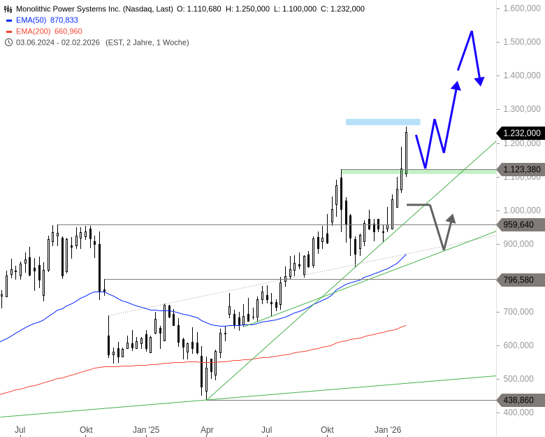 Von dieser Supportzone aus könnte allerdings schon der nächste Ausbruchsversuch starten. Gelingt ein Anstieg über rund 1.265 USD, dürfte die Monolithic-Power-Aktie weiter bis 1.360 USD, sowie mittelfristig bis an das nächsthöhere Zielgebiet um 1.520 USD steigen.