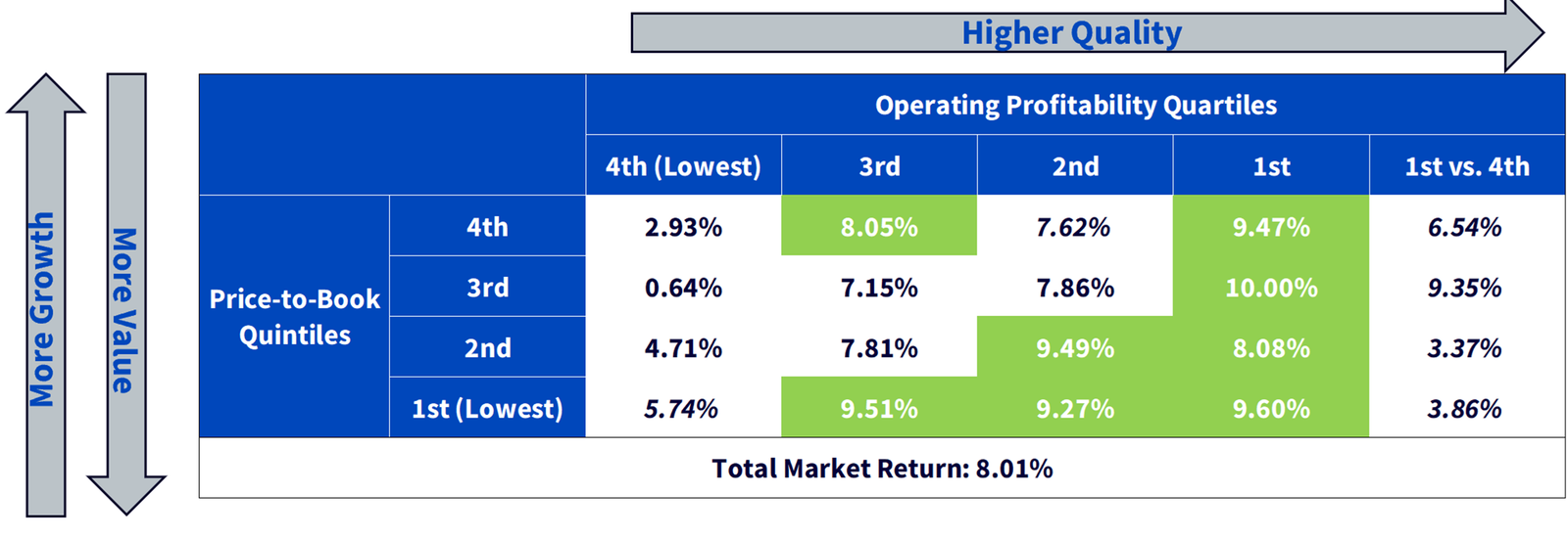 Die Bedeutung von Qualität wird noch deutlicher, wenn man die Wechselwirkungen zwischen Rentabilität und Bewertungs- und Wachstumsmerkmalen betrachtet.