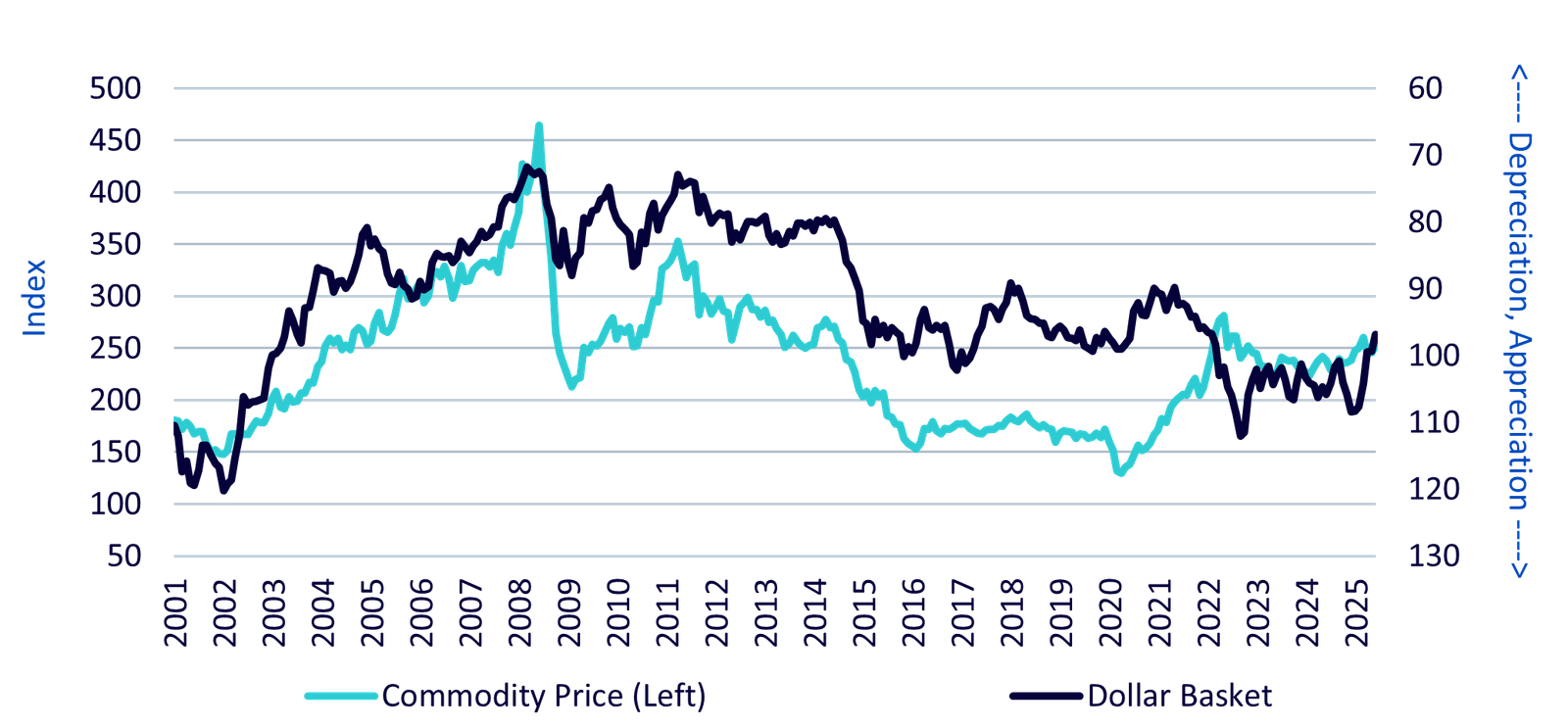Quelle: WisdomTree, Bloomberg, Januar 2001–Juni 2025. Bloomberg Commodity Index Total Return und Dollar-Korb (DXY). Die historische Wertentwicklung ist kein Hinweis auf die künftige Wertentwicklung, und Anlagen können im Wert sinken.