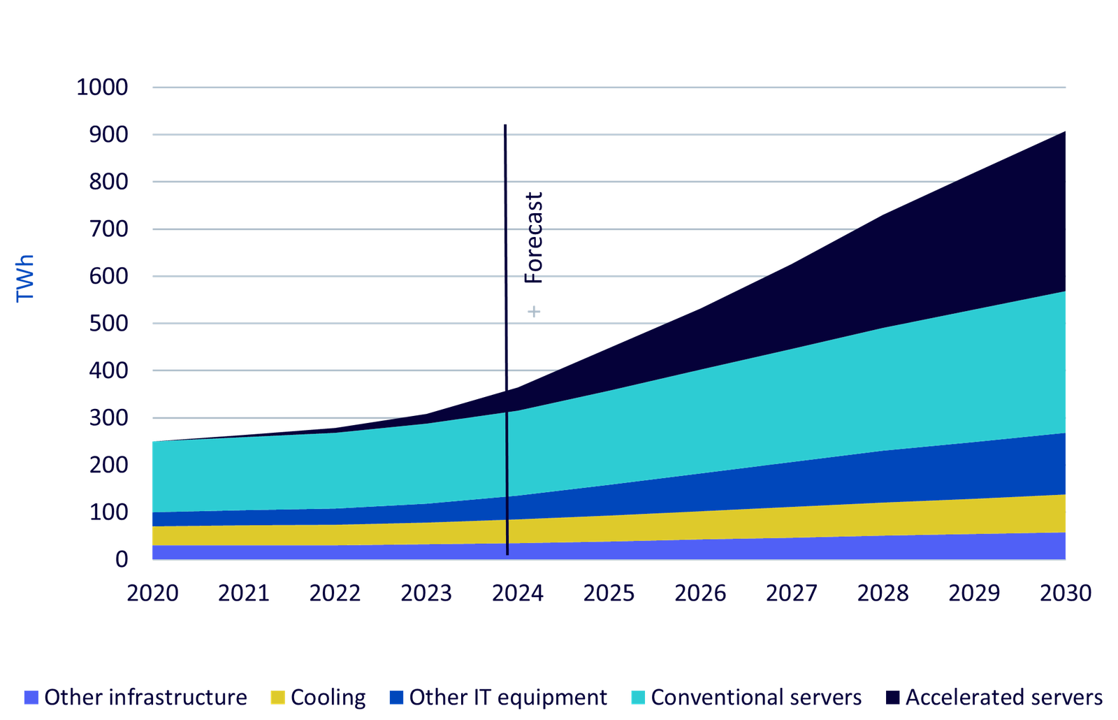 - KI und digitale Infrastruktur: Rechenzentren haben einen hohen Energiebedarf (Abbildung 2) und treiben damit indirekt die Nachfrage nach Metallen an, die eine nachhaltige Stromerzeugung ermöglichen.