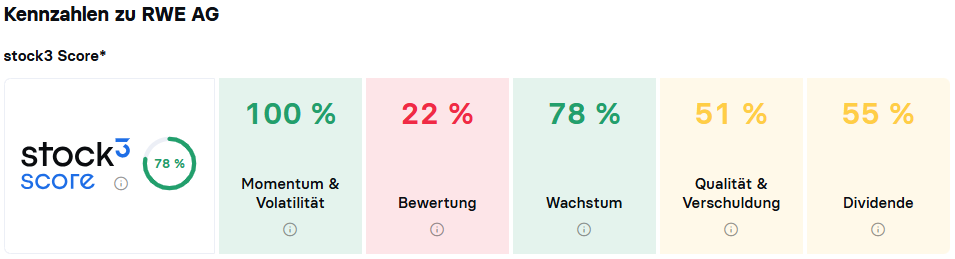 Fazit: Angesichts der Energiewende und des durch den KI-Ausbau kräftig steigenden Strombedarfs investiert RWE massiv in die eigenen Erzeugungskapazitäten, was sich für den Konzern und die Aktionäre in den kommenden Jahren in Form höherer Gewinne bemerkbar machen dürfte. Im stock3 Score punktet die RWE-Aktie aktuell vor allem mit einem hohen Kursmomentum und dem kräftigen Wachstum, das für die kommenden Jahre erwartet wird. Im Score-Depot erfolgte der Einstieg bei RWE im Oktober 2025 zu einem Kurs von 40,40 EUR. Auch auf dem aktuellen Niveau bleibt die Aktie vorerst attraktiv, was das Abschneiden im stock3 Score und das unvermindert hohe Kursmomentum zeigen.