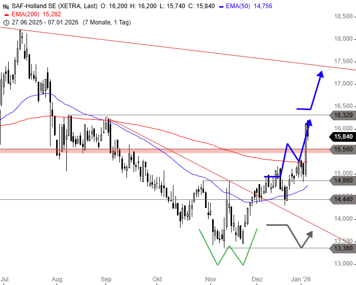 Doch mit der breiten Bodenbildung im Herbst und der erwarteten Auflösung einer bullischen Doppelbodenformation meldeten sich die Käufer im Dezember zurück und sorgten jetzt mit dem rasanten Ausbruch über den Widerstand bei 15,56 EUR für ein weiteres Kaufsignal.