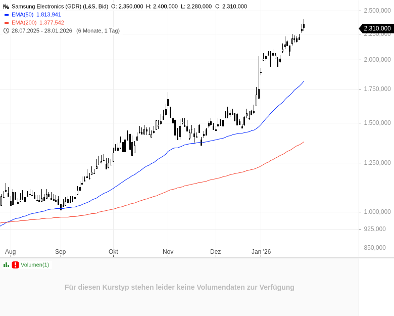 • Samsung Electronics (GDR) – WKN: 896360 – ISIN: US7960508882 – Kurs: 2.340,000 € (L&S)
