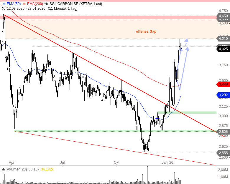 - SGL CARBON SE – WKN: 723530 – ISIN: DE0007235301 – Kurs: 4,025 € (XETRA)