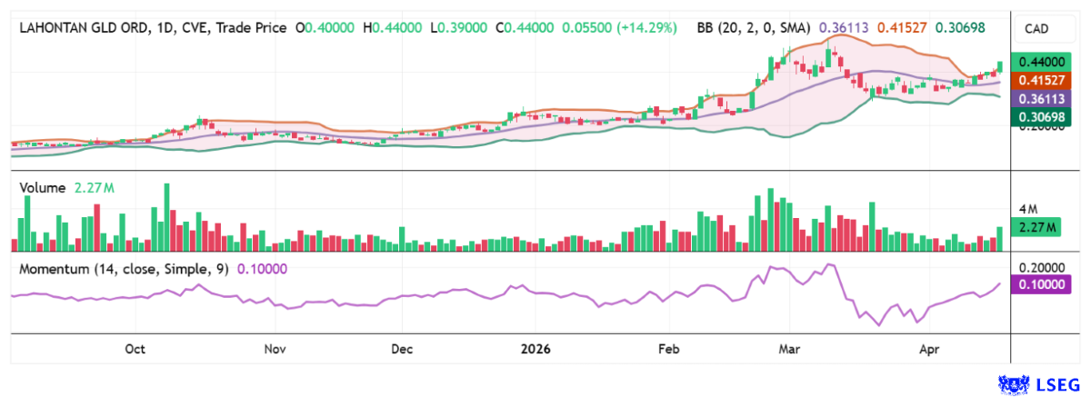 Die Aktie von Lahontan Gold konnte sich in den letzten 7 Monaten noch einmal auf glatt 0,45 CAD verdoppeln, nachdem sie seit Anfang 2025 bereits 500 % Rendite erzielte. Nach gelungener Refinanzierung springen risikobewusste Anleger erneut auf. Im Bollinger-Chart zeigt sich bereits ein momentumgetriebener Ausbruch nach oben. Quelle: LSEG Refinitiv vom 20.04.2026