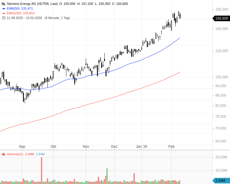 Fazit: Die Zahlen zeigen ein Unternehmen, das vom globalen Investitionsschub in Energieinfrastruktur massiv profitiert. Der Rekordauftragsbestand verschafft hohe Visibilität, die operative Marge liegt bereits über dem Jahresziel. Die Bewertung der Siemens-Energy-Aktie ist ausgesprochen hoch, solange das Unternehmen aber liefern kann, wird sich das kaum ändern. Der Trend ist intakt.