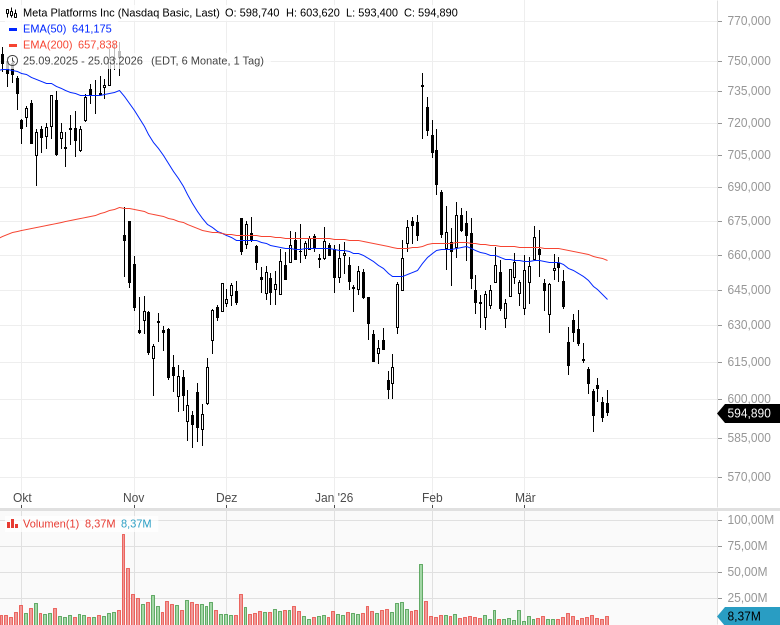 - Meta Platforms Inc – WKN: A1JWVX – ISIN: US30303M1027 – Kurs: 594,890 $ (Nasdaq)