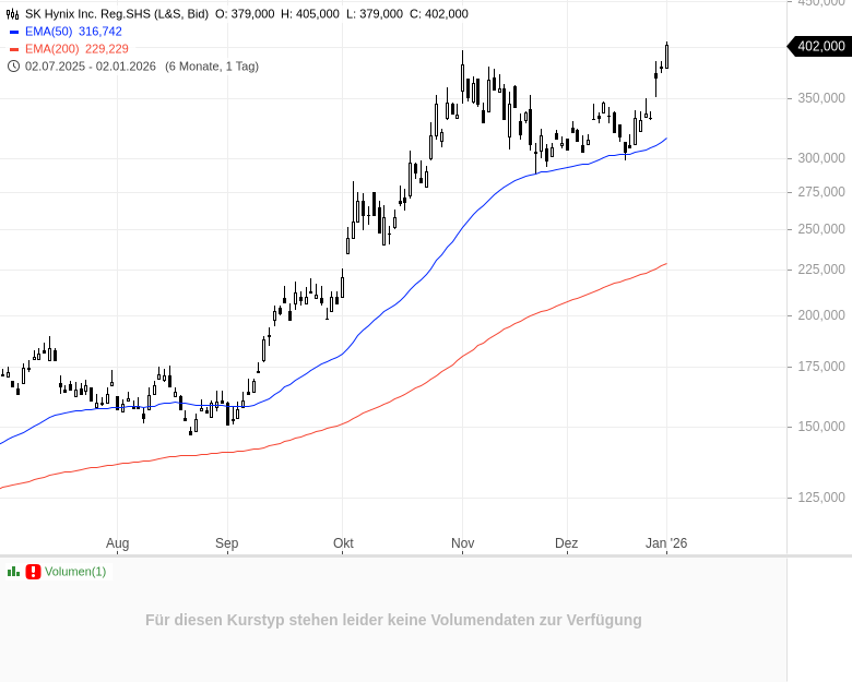 - SK Hynix Inc. Reg.SHS – WKN: A1JWRE – ISIN: US78392B1070 – Kurs: 405,000 € (L&S)