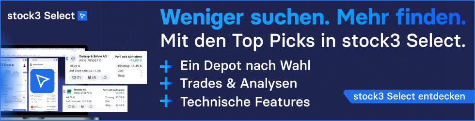 Mit unserem neuesten Service stock3 Select hast Du vollen Einblick in ein aktives Experten-Depot, inklusive aller Signale und Updates. Außerdem sicherst Du Dir tägliche Analysen sowie die spannendsten Top-Picks der stock3-Experten und technische Vorteile! Auch ich bin Teil von stock3 Select! Jetzt bestellen.