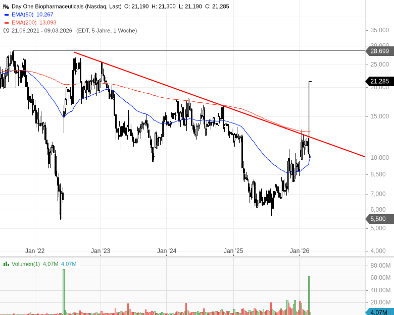 Erst Mitte Januar hatte ich Day One Pharmaceuticals ausgegraben und für unsere Leser eine ausführliche Einschätzung verfasst. Damaliger Kurs: 11,33 USD!