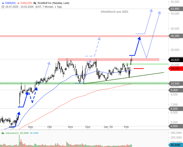 Setup: Die Aktie des Rechenzentrenbetreibers für Bitcoin-Mining und KI-Anwendungen attackierte gestern die Hochs aus 2025 und damit die Oberkante der mehrmonatigen Seitwärtsrange. Ein nachhaltiger Ausbruch fand jedoch nicht statt, die Käufer machten doch noch einen Rückzieher. Klettert die TeraWulf-Aktie jetzt über das gestrige Hoch und beendet den Handel auch oberhalb von 17,30 USD, werden prozyklische Einstiege interessant. Sowohl kurzfristige Ausbruchsbewegungen als auch ein mittelfristiger Anstieg zum Allzeithoch könnten hier angepeilt werden.