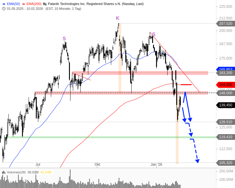 Setup: Die Palantir-Aktie geriet in den vergangenen Wochen deutlich unter Druck und vollendete dabei eine bärische SKS als mittel- bis langfristige Trendwendeformation. Nach einem schwungvollen Abverkauf kam es zuletzt zu einem Rücklauf bis fast an den Triggerbereich bei 147 – 149 USD. Knapp darunter prallte der Wert gestern nach unten hin ab. Damit könnte eine weitere Abwärtswelle folgen. Short-Trades wären mit dem bärischen Pullback jetzt direkt interessant, wobei gestern definitiv der bessere Tag für Positionierungen gewesen wäre. Vielleicht erholt sich das Papier nochmals in Richtung 147 – 149 USD. Umso näher ein Short-Einstieg an diesem Preisniveau erfolgt, umso besser wird das Chance-Risiko-Verhältnis (CRV).