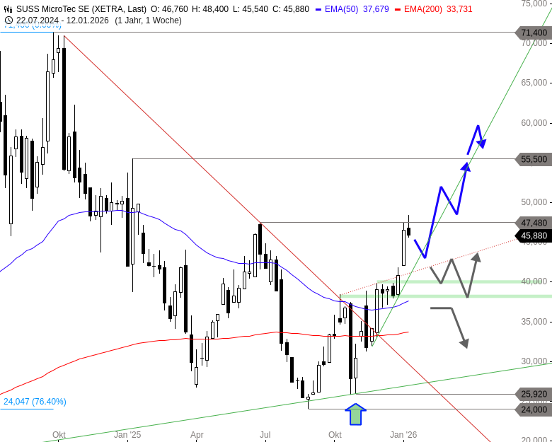 Der nächste größere Widerstand auf der Oberseite ist das Hoch aus dem Januar 2025 bei 55,50 EUR. Oberhalb dieser Marke hätte die Aktie von Suss Microtec sogar schon den Platz, um auf Sicht einiger Wochen bis 59 EUR zu steigen.