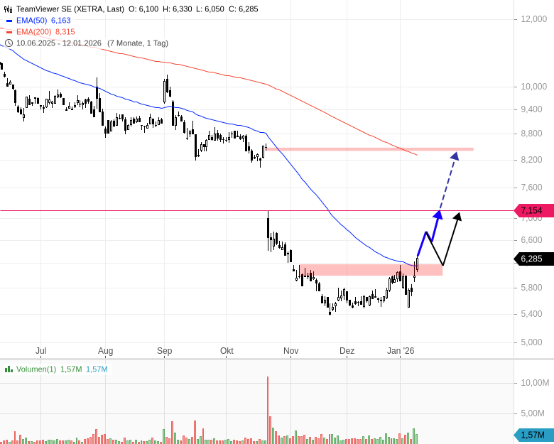 Als erstes realistisches Ziel in der Aktie von Teamviewer sehe ich mindestens die Gap-Unterkante vom Oktober 202 (siehe Chart unten), rund 7,15 EUR. Sofern die Zahlen und besonders der Ausblick im Februar nicht enttäuschen, ist auch deutlich mehr drin.