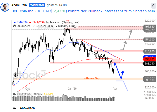 Tesla war gestern zwei Mal Thema in unserem Traders Talk, der ultimativen Informations- und Austauschplattform und die Schnittstelle zwischen Experten und Lesern. Am frühen Nachmittag hatte ich auf das potenzielle Short-Setup hingewiesen, kurz darauf berichtete Harald Weygand über die spektakuläre Kehrtwende des Perma-Bullen Trip Chowdhry, Managing Director bei Global Equities Research. Mit dem Traders Talk bist Du immer direkt am Puls der Märkte und hast die interessantesten Trading-Setups im Blick. Jetzt testen: