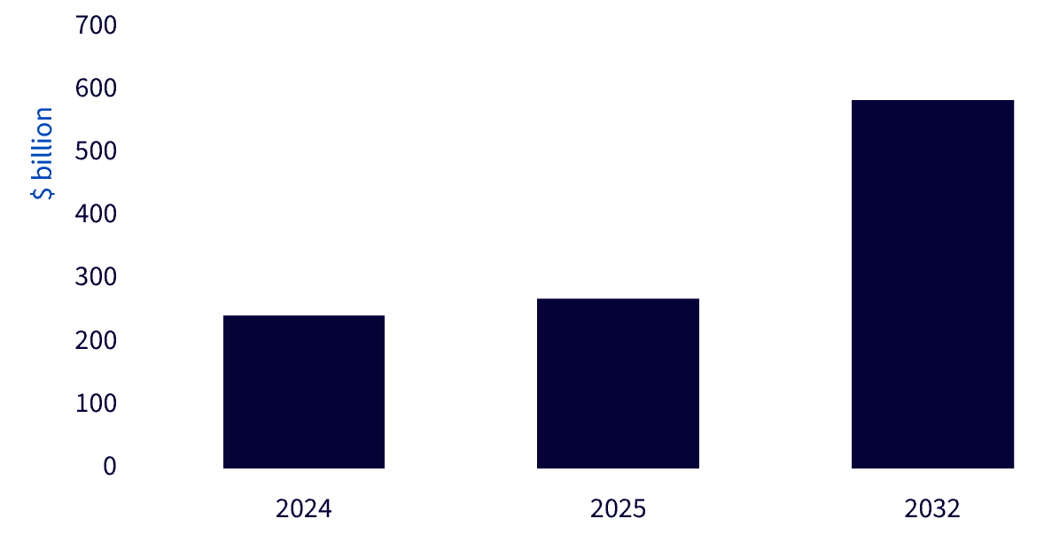 Quelle: Fortune Business Insights, Dezember 2025. Prognosen sind kein Hinweis auf die künftige Wertentwicklung, und alle Anlagen sind mit Risiken und Ungewissheiten verbunden.