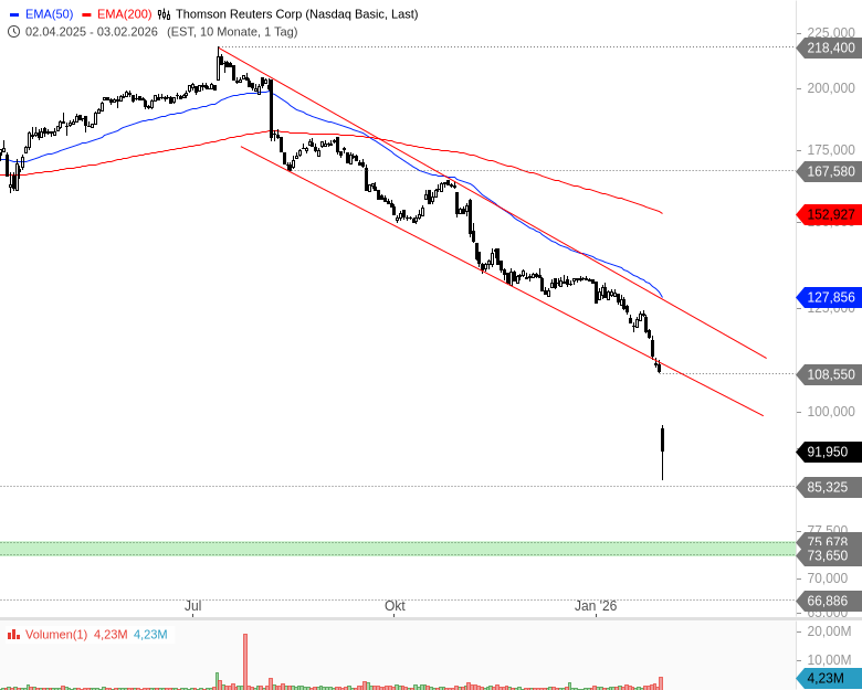 Fazit: Galten Unternehmen der Daten- und Beratungsbranche einst als Hauptprofiteure des KI-Zeitalters, äußern Händlern und Analysten nun Befürchtungen hinsichtlich einer KI-bedingten Disruption. Die Anleger lassen momentan viele Aktien dieser Branchen fallen, dazu gehört auch Thomson Reuters. Der morgige Quartalsbericht könnte für weitere Bewegung sorgen und den verunsicherten Anlegern vielleicht etwas Klarheit verschaffen.