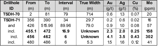 TSDH-78: 169,71 m mit 0,9 g/t Au ab 278,29 m, einschließlich