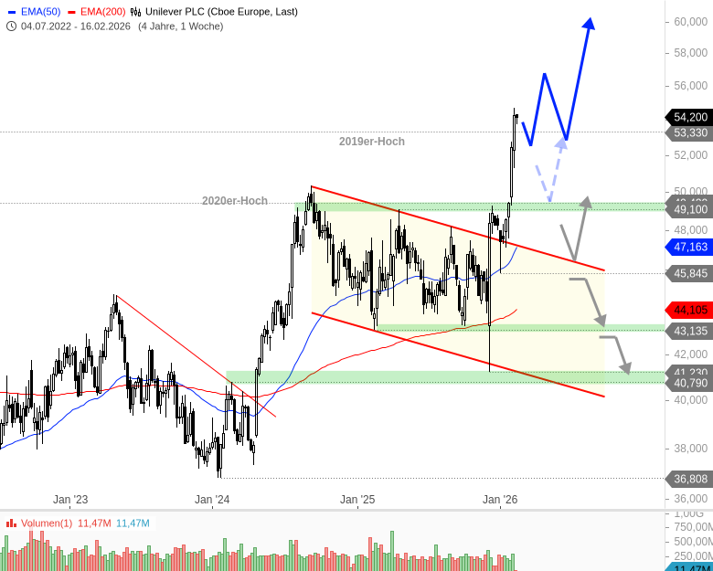 Die Aktie konnte zuletzt aus der seit 2024 andauernden Flaggenkonsolidierung nach oben hin ausbrechen. Die Folge war eine steile Rallybewegung, nachdem auch die Zwischenhochs aus 2020 und 2024 überwunden wurden. Jetzt geht es auch über das Allzeithoch aus 2019 bei 53,33 GBP hinaus.