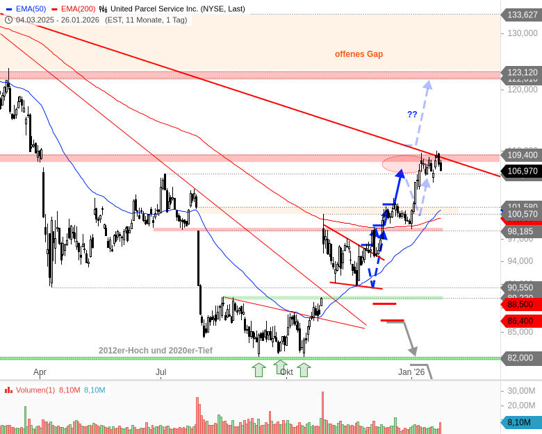 Die UPS-Aktie bewegt sich bislang perfekt in den Bahnen des Prognoseszenarios der letzten Analyse (UPS – Ein sehr spekulatives Szenario). Nach der zweiwöchigen Konsolidierung am Kreuzwiderstand bei 108,20 – 109,40 USD erfolgt im vorbörslichen Handel der Ausbruch darüber.