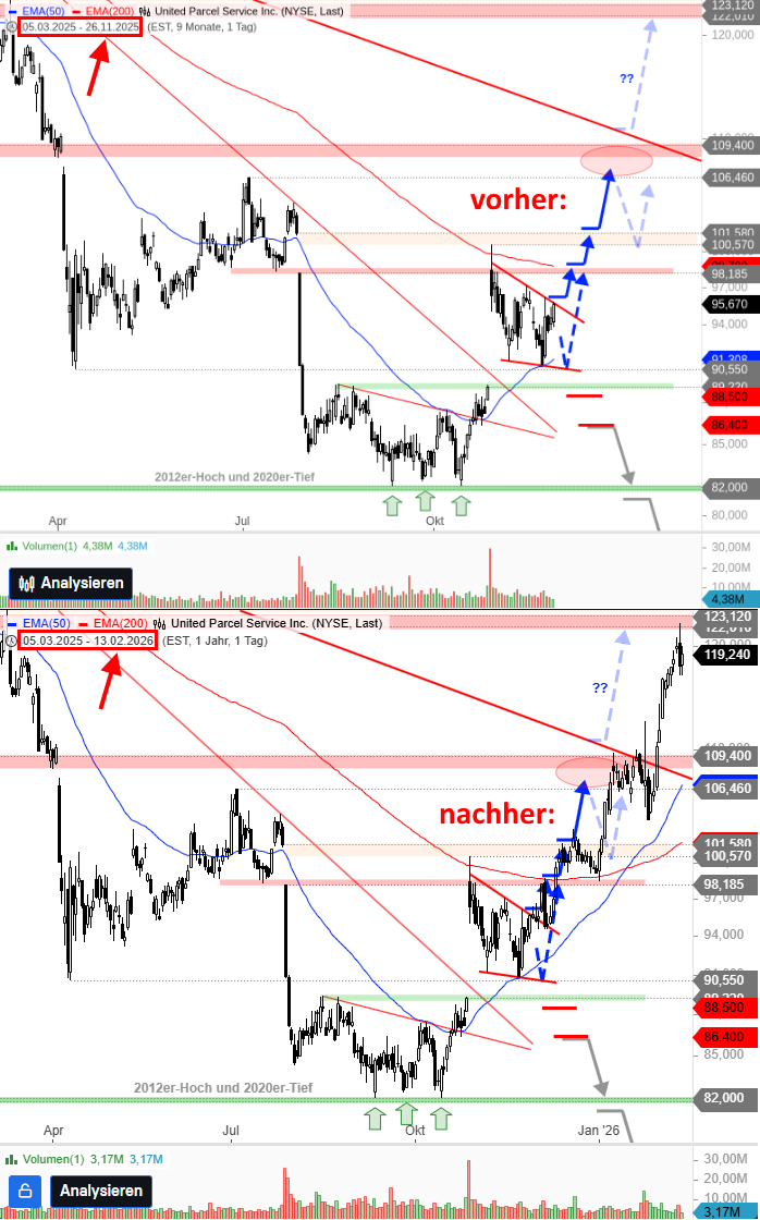 Fazit: Die UPS-Aktie hat die erwartete Erholung idealtypisch abgespult und die kurz- bis mittelfristigen Ziele erreicht. Ob eine langfristige Trendwende mit dieser Vorlage möglich ist, bleibt abzuwarten. Kurzfristig könnten ab jetzt oder spätestens nach dem Erreichen des EMA200 Zwischenkorrekturen anstehen.