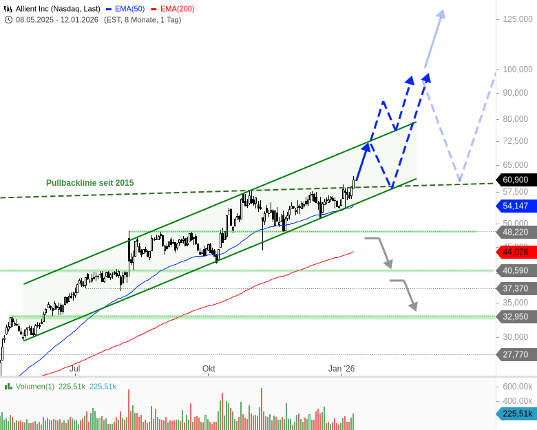 Fazit: Die Allient-Aktie startet stark ins neue Jahr und könnte mit dem Verlassen der Seitwärtskonsolidierung seit Oktober sowie dem Ausbruch über die Pullbacklinie seit 2015 große Kaufsignale erzeugen. Eine Rallybeschleunigung wäre hier nicht ungewöhnlich.