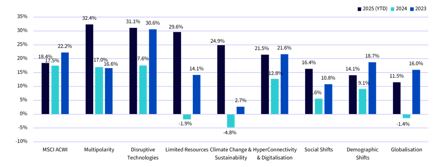 Das Thema „Blockchain“ rundete die Top 5 der besten Performer ab und profitierte nicht nur von unterstützenden politischen Entwicklungen in den USA, sondern auch von der strategischen Neuausrichtung der Krypto-Miner auf die Bereitstellung von Hochleistungs-Computing-Infrastruktur, um die Zunahme der KI-bezogenen Workloads zu meistern. Insgesamt erzielten die fünf besten Themen Renditen zwischen 21 % und 36 % und zeigten damit eine deutliche Outperformance gegenüber den breiten Aktienmärkten. Die starke Outperformance verschiedener Themen im Jahr 2025 gegenüber globalen Aktien ist im Vergleich zu den Vorjahren besonders deutlich (siehe Abbildung 2).