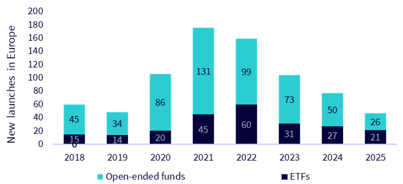 Abflüsse aus offenen Themenfonds haben eine merkliche Verlangsamung bei der Auflegung neuer Strategien durch aktive Vermögensverwalter bewirkt. Im Gegensatz dazu hat sich die Ausgabe von ETFs im Jahr 2025 im Vergleich zu 2024 verstärkt, was die zunehmende Divergenz in der Produktentwicklung verdeutlicht. Diese sich vergrößernde Kluft könnte offene Fonds weiter benachteiligen, da sie Gefahr laufen, bei wichtigen neuen Themen, die das Anlegerinteresse und das Vermögenswachstum in Zukunft vorantreiben dürften, den Anschluss zu verlieren.