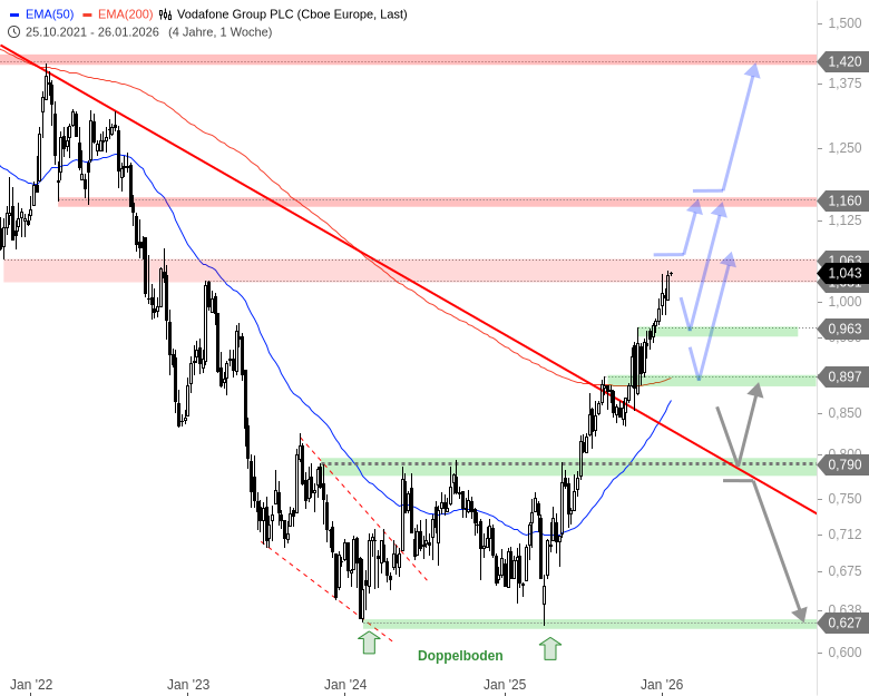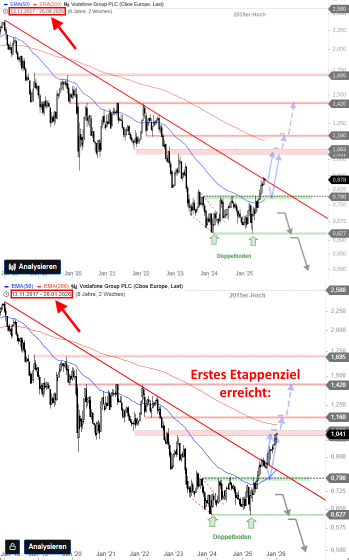 2025 gelang der Vodafone-Aktie ein bullisches Reversal am 2024er-Tief und anschließend die Vollendung eines Doppeltops. Als die mehrjährige Abwärtstrendlinie unter Beschuss kam, wurde in der Plus-Analyse im Sommer auf das große Erholungspotenzial bei einem Ausbruch hingewiesen. Das erste Etappenziel bei 1,03 – 1,06 EUR wurde jetzt erreicht.