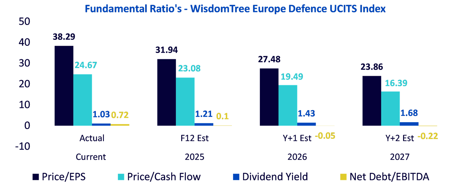 Nach dem Rebalancing im September ist der WisdomTree Europe Defence UCITS Index für starkes Gewinnwachstum positioniert: Der Gewinn je Aktie wird in einem Jahr voraussichtlich um 16 % und in den nächsten beiden Jahren um 15 % steigen.13 Das spiegelt wachsende Marktanteile, die mehrjährigen Beschaffungszyklen und die steigenden Verteidigungshaushalte in Europa wider. Auch wenn der Cashflow je Aktie vorübergehend einbrechen kann, da die Unternehmen ihre Geschäftstätigkeit ausweiten, dürfte die Verschuldung sinken, was finanzielle Stabilität gewährleistet.