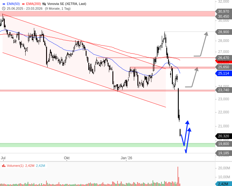 Fazit: Die Vonovia-Aktie befindet sich im Crash-Modus und ist außer für antizyklische, kurzfristige Trades mit hohem Risiko eher uninteressant. Trendwendeansätze sollten hier abgewartet werden, insbesondere eine Rückkehr über die alten Jahrestiefs aus 2025 und 2026 würde die charttechnische Situation deutlich verbessern.