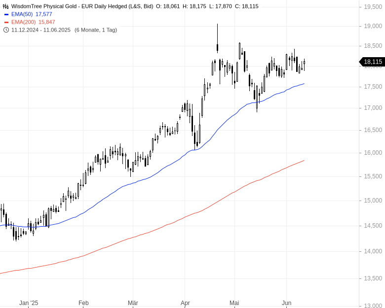 - WisdomTree Physical Gold – EUR Daily Hedged – WKN: A1RX98 – ISIN: JE00B8DFY052 – Kurs: 18,115 € (L&S)