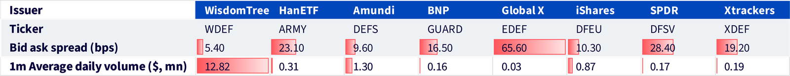 Abbildung 4: Geld-Brief-Spanne und Tagesvolumen vs. andere europäische Verteidigungs-ETFs