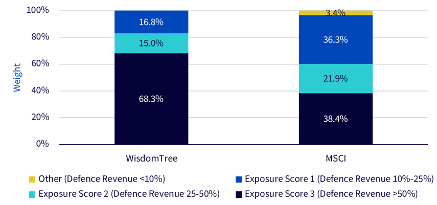 Abbildung 2b: Aufschlüsselung nach Exposure Score: WisdomTree Europe Defence UCITS Index vs. MSCI Europe Aerospace & Defence Index