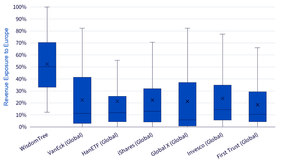 Quelle: WisdomTree, FactSet, Stand: 30. September 2025. „X“ steht für das arithmetische Mittel des Umsatzengagements der Bestände. Es ist nicht möglich, direkt in einen Index zu investieren. Die historische Wertentwicklung ist kein Hinweis auf die künftige Wertentwicklung, und Anlagen können im Wert sinken.