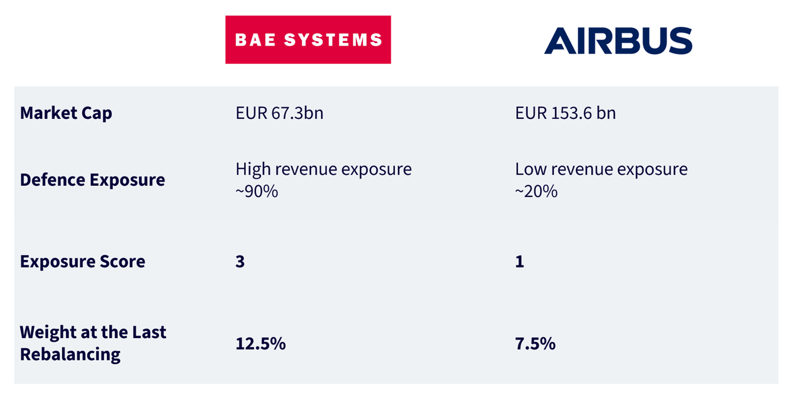 In einem reinen europäischen Universum bestimmt die Gewichtung der Bestände die Reinheit des Engagements. Einfache Marktkapitalisierungsmethoden begünstigen die größten Unternehmen, die nicht immer am stärksten mit Verteidigungsaktivitäten in Verbindung stehen. WDEF bezieht den Umsatz aus Verteidigungsaktivitäten in die Konstruktion ein und gewichtet damit Unternehmen stärker, die in direkterem Zusammenhang mit Verteidigungsausgaben stehen. Den infrage kommenden Unternehmen werden Exposure Scores zugewiesen, die auf dem Umsatzengagement bei Verteidigungsaktivitäten basieren: Score 3 (>50 %), Score 2 (25–50 %) und Score 1 (10–25 %). Höhere Scores erhalten eine größere Gewichtung, vorbehaltlich Liquiditäts- und Risikobeschränkungen.