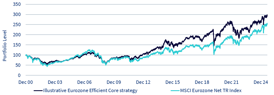 Quelle: Bloomberg, WisdomTree, MSCI®. Vom 29. Dezember 2000 bis zum 29. August 2025. Tägliche Daten in EUR. Eurozone Efficient Core wird durch die Backtesting-Indexperformance ohne ESG-Filter dargestellt. Es ist nicht möglich, in einen Index zu investieren. Die historische Wertentwicklung ist kein Hinweis auf die künftige Wertentwicklung, und Anlagen können im Wert sinken.